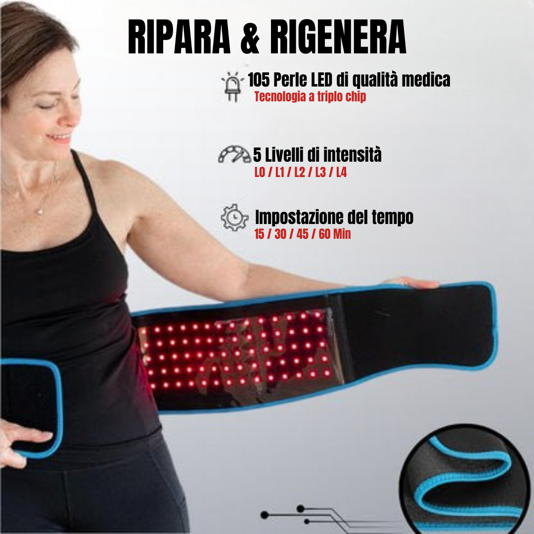 La cintura Luminora™ per la Terapia con Luce Rossa utilizza la luce infrarossa per penetrare in profondità, stimolando la produzione di energia cellulare e promuovendo i processi naturali di guarigione dall’interno.